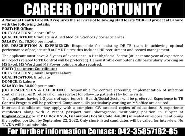 National Health Care NGO Jobs 2022 for HR Officer and Treatment Coordinator Vacancies