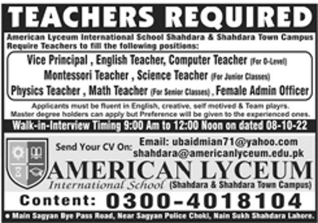 American Lyceum School Lahore Jobs 2022 for Teachers and Non-Teaching Staff