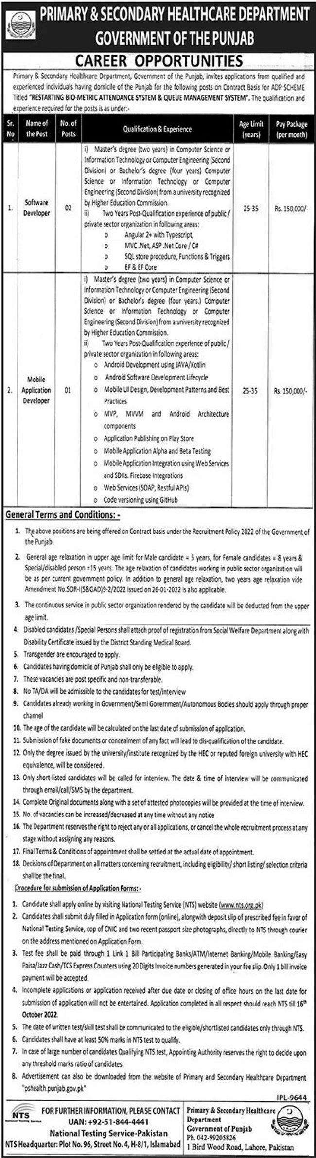 PS Healthcare Department Punjab Jobs 2022 for Software Developers and Mobile Application Developer Vacancies