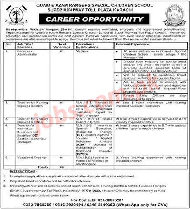 QA Rangers Special Children School Karachi Jobs 2022 for Teachers and Principal Vacancies