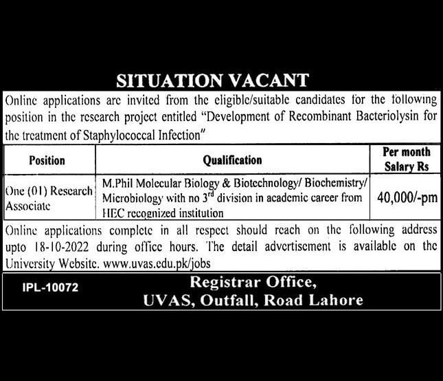 UVAS University Jobs 2022 for Research Associate Vacancy