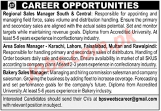 BPS Sweets Jobs 2022 for Bakery Sales Manager, Area and Regional Sales Managers (Lahore, Karachi, Rawalpindi & Other)