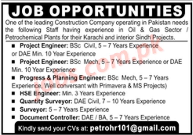 Karachi Leading Construction Company Jobs 2022 for Project Engineers, Quantity Surveyors, Surveyors, Document Controller & Other