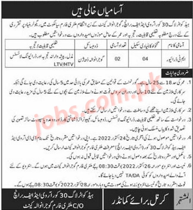 Pak Army Jobs 2022 for MT Drivers Vacancies at HQ Log 30 Corps Gujranwala