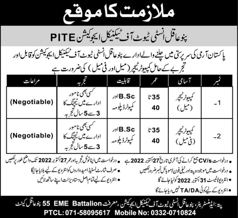 Pak Army PITE Pano Aqil Jobs 2022 for Computer Teachers Vacancies