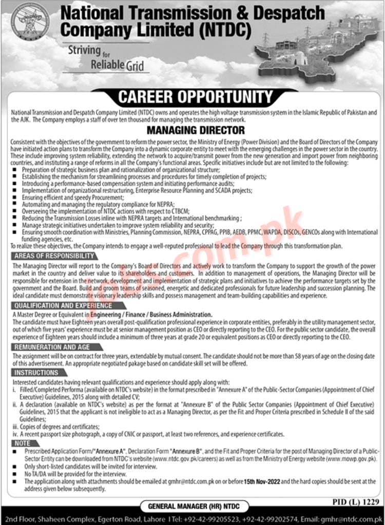 National Transmission & Despatch Company (NTDC) Jobs 2022 for Managing Director / MD Vacancy