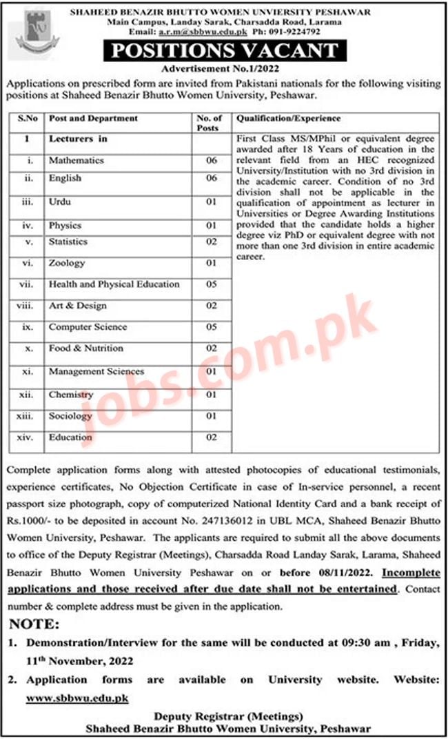 SBB Women University Peshawar Jobs 2022 for Teaching Faculty