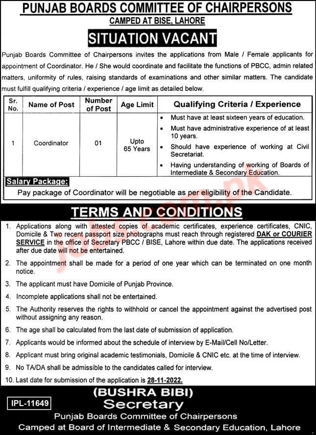Punjab Boards Committee Of Chairpersons Jobs 2022 for Coordinator Vacancy