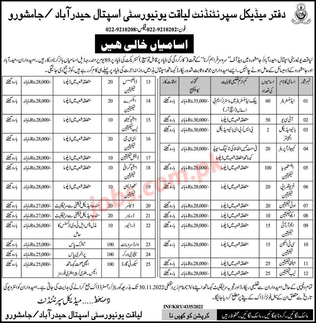 Liaquat University Hospital Hyderabad / Jamshoro Jobs 2022 for Admin, Computer Operator, Paramedical, Drivers and Other