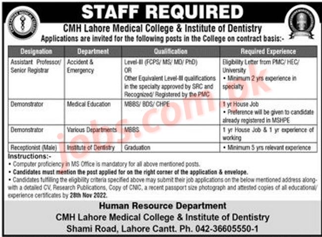 CMH Lahore Jobs 2022 for Teaching Faculty and Non-Teaching Staff