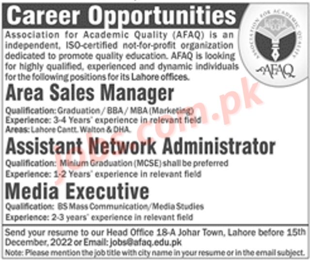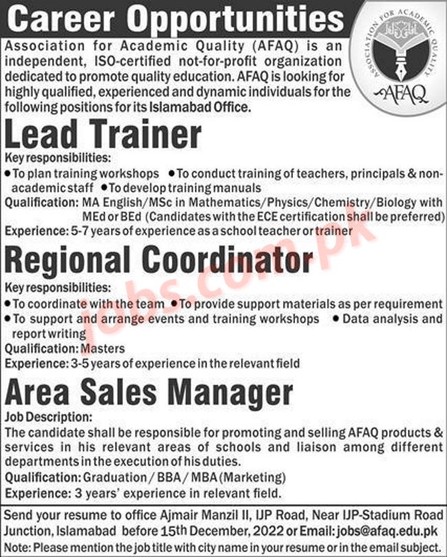 AFAQ Jobs 2022 for Lead Trainer, Regional Coordinator, Sales Managers and Other