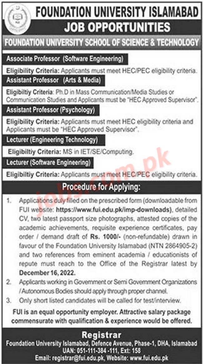 Foundation University Islamabad Jobs 2022 for Teaching Faculty Vacancies