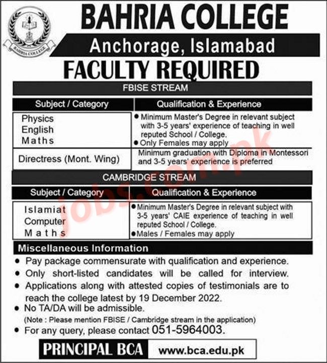 Bahria College Islamabad Jobs 2022 for Teaching Faculty Vacancies