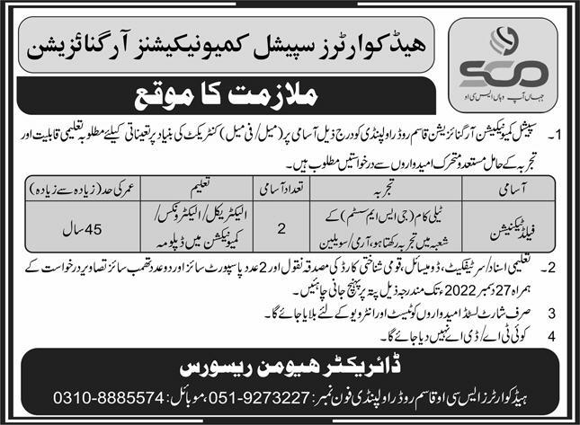 Pak Army Special Communications Organization Jobs 2023 for Field Technicians and Project Engineers Vacancies