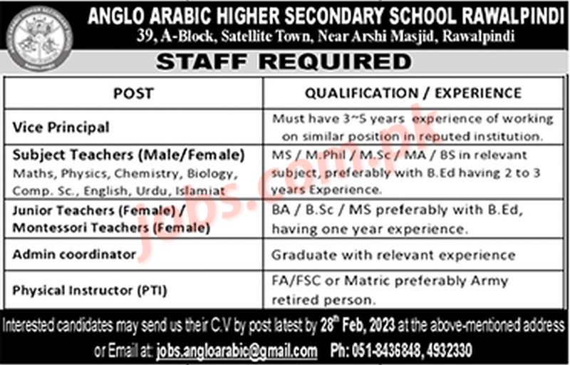 Anglo Arabic Higher Secondary School Rawalpindi Jobs 2023 for Subject Teachers, Jr Teachers and Non-Teaching Staff